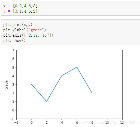 如下所示,在第一行代码 plt.plot() 中 输入两组数组或者列表,将默认前者为 x 的数据,后者为 y 的数据。plt.axis([-2,12,-1,7]) 分别定义了 x 和 y 的范围。